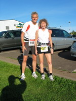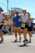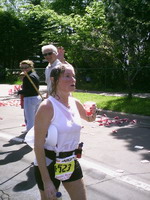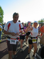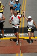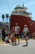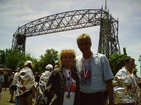 Jede Meile war durch eine Luftballongirlande schon von weitem zu erkennen. Es gab an jeder Meile Wasser, Ultima (Elektolythgetränk), Eiswürfel und Schwämme). Die Organisation war wirklich super. Die wenigen Zuschauer machten, wenn sie denn da waren einen heiden Spektakel, feuerten uns mit „Good Job“ oder „Where are you going?“ (was für eine Frage) an und machten auch sonst gute Stimmung. Es spielten Bands, an kleinen Häuschen plärrten Gettoblaster, an den Protzigeren standen sehr große Lautsprecher auf der Straße, so dass die Musik schon von weitem zu hören war. Man reichte uns Brownies, Donuts, Erdbeeren, Bananen und Apfelsinenscheiben. Die disziplinierten Amis standen auch immer wieder an den am Straßenrand aufgestellten Dixies an. Da ich schon an fast jeder Meile ein Gehpause zum Trinken einlegte (hatte ja nur drei Flaschen) wollte ich mich dort nicht auch noch anstellen, so huschten wir immer mal wieder in die Büsche. Bei Meile 13 hoffte ich unsere Freunde und meine Kinder zu sehen. Da tobte wirklich der Bär, aber ich sah sie nicht. Meine Motivation ließ etwas nach und ich beklagte mich gerade bei Thomas, wie schade ich das finde. Dann nach der nächsten Kurve sah ich sie. Die ganze Familie stand dort, feuerte uns an und Kris, die Gastmom begleitete mich ein kurzes Stück. Warum ich so langsam liefe, fragte sie. Erstaunt sah ich sie an. Schließlich habe ich schon 13 Meilen hinter mir. Die Kinder umarmten uns und gleich ging es weiter. Bei Meile 18 bekam Thomas plötzlich Magenprobleme (gechlortes Wasser? Hihi…) und musste das Tempo deutlich reduzieren und Gehpausen einlegen. Er wollte, dass ich weiterlaufe und mein Ding allein durchziehe, er würde schon wieder aufschließen. Nach 2 Meilen hatte er das Tief aber überwunden und wir liefen wieder gemeinsam (natürlich nur, weil ich mich zurück hielt). Meile um Meile schlängelte sich die Küstenstraße dahin. Hin und wieder öffnete sich der Blick über den See und weit entfernt am Horizont erkannte man die Hafenbrücke – das Ziel. Es schien jedoch nicht näher zu rücken. Ca. 6 Meilen vor dem Ziel trifft die Küstenstraße auf den Highway. Als wir auf den Highway einbiegen, schon wieder eine lange Steigung. In den Randgebieten von Duluth wurde die Zuschauermenge schon dichter und ich genoss die Anfeuerungsrufe. Die letzten Meilen durch die Stadt hinunter zum Hafen. Ich sehnte das Ende herbei. Von einer Brücke herunter sahen wir schon das Messegelände. Dahinter sollte sich die Ziellinie befinden. So glaubten wir jedenfalls. Hinter den Hallen jedoch kein Ziel, sondern das Hafenbecken. Thomas tröstet mich, hinter dem großen Schiff ist das Ziel. Sein GPS zeigte, dass wir noch wenige 100m vor uns hätten. Denkste, nichts zu sehen. Auf Thomas Uhr waren die 42 km schon vorbei. Mir fiel der Spruch ein, den ich bei einem Läufer im Startbereich gesehen hatte. „It sucks!“ (frei übersetzt: „es ist scheisse was wir hier machen“) So dachte ich nun auch. Ok, hinter der nächsten Kreuzung. Wieder nichts… aber jetzt: Ballongirlanden, den Sprecher hört man und die Menschen stehen jetzt dicht an dicht. Ich fühle mich gut und locker, alle Strapazen fallen von mir ab als wir die Ziellinie überqueren und endlich reißen wir auch die Arme hoch und freuen uns beim Zieleinlauf, so wie die vielen von null auf 42er in Mainz. Die Uhr sagt 04:23:44 und obwohl die Zeit gar keine Rolle gespielt hat, freue ich mich wie wahnsinnig.