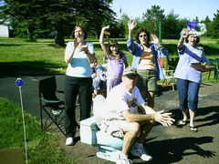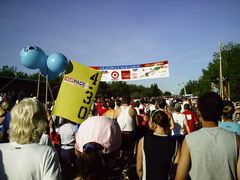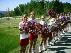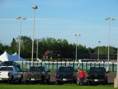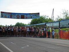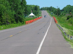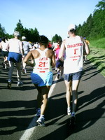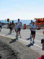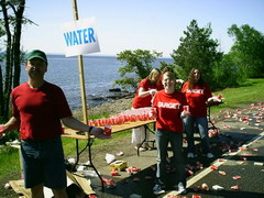 Am Morgen um 06.00h strahlend blauer Himmel. Der Startbereich liegt über 20 Meilen außerhalb von Duluth an der Küstenstraße und war nur mit ein paar Flatterleinen gekennzeichnet. Die gelben Schulbusse, die die Läufer aus den umliegenden Städten brachten reihten sich dicht an dicht. Auf dem großen Parkplatz war hektische Betriebsamkeit. Läufer dehnten sich oder standen an den hunderten Dixieklos an. Lastwagen würden unsere Sweatbags zum Ziel bringen und die Stimmung unter den fast 7000 Läufern war riesig. Aber so mitten in der Wallachhei - oder wie auch immer das geschrieben wird - waren bis auf einige Angehörige keine Zuschauer. Und so sollte es auch Meile für Meile bleiben, denn die Küstenstraße war ja gesperrt und Zuschauer konnten nur an wenigen Kreuzungen stehen oder bei den einzelnen verstreut stehenden Häusern. Lediglich einige hundert Meter wurden wir von Zuschauern aus einem Zug heraus angefeuert, der parallel zur Straße fuhr. Ich merkte schnell, dass dieser Marathon eine reine Kopfsache werden würde. Du siehst die gerade weite Straße, die Sonne brennt (28°C) und du musst dich immer wieder selbst motivieren. Doch die Mitläufer waren klasse, man konnte ab und zu plaudern und die schärfsten Gestalten sehen. Lustige Aufdrucke auf den Shirts lenkten einen von der Eintönigkeit ab. Im Internet war der Kurs als flach angegeben, doch schon bald sah ich weit vor uns wie der Läuferstrom sich immer wieder nach oben bewegte, so dass auch ich die Menschenmenge sehen konnte (da ich so klein bin, sehe ich sonst nur die Rücken vor mir). Endlos kam mir die Strecke vor, links erstreckt sich der Lake Superior bis an den Horizont, der zweitgrößte See See der Erde. Der See soll so kalt sein, dass man darin nicht baden kann. Nach nur 4 Minuten im Wasser soll man an Herzversagen sterben. Die Temperatur stieg unaufhörlich und ich war froh ein Basecap zu tragen.